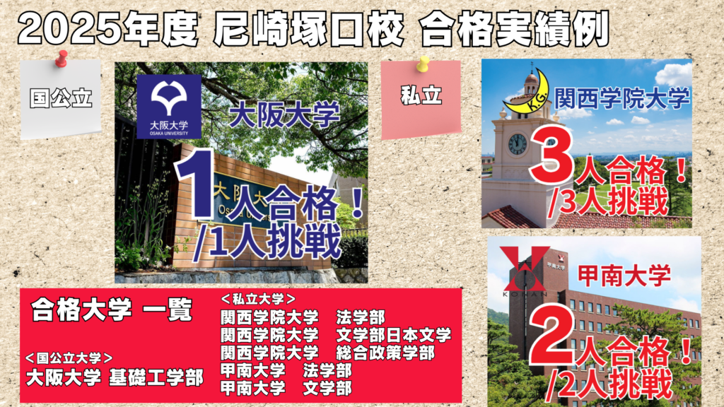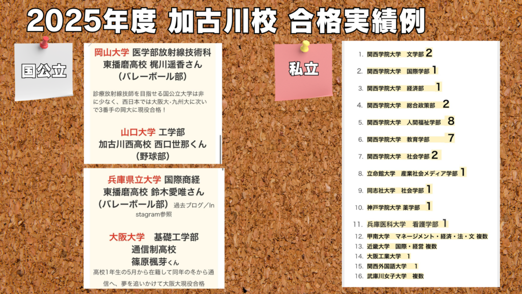 合格実績 2025年度 ※合格実績 2025年度(春名英語塾加古川校・塚口校の実績となります) 2025年度 体験記等はインスタグラムにてアップ中! インスタグラムはこちら!Click 2024年度合格実績・体験記はこちらから